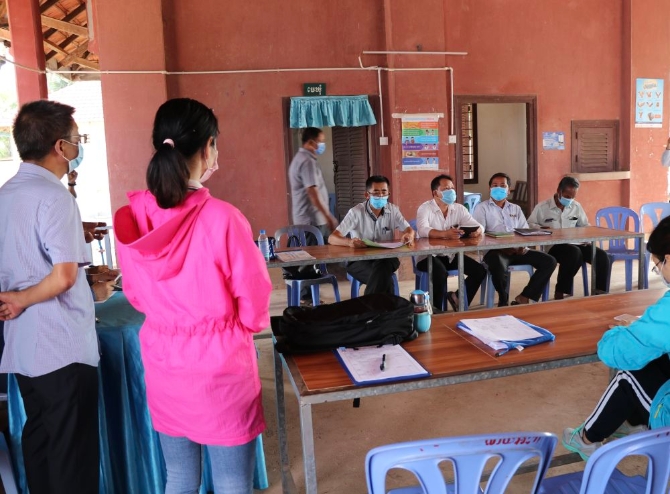 5月15日,在柬埔寨干丹省莫穆坎普县的斯瓦安普乡,中国援助柬埔寨减贫示范合作项目中方专家组组长袁刚(左一)和柬文翻译周冰姣(左二)与柬方政府官员和村民开会。(新华社发,高炳南摄)