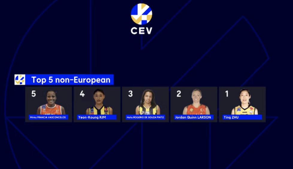 今年,欧排联评选了近20年参加过欧冠比赛的前五名,非欧洲女排运动员中,朱婷荣获第一名。