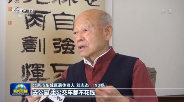 北京市东城区退休老人 刘志杰(93岁):原来90岁给200元(高龄津贴)现在给500了,去公园、坐公交车都不花钱,而且工资年年调整,我们得到这么多实惠非常感谢习近平总书记,我还要在总书记领导下健健康康多活些年。