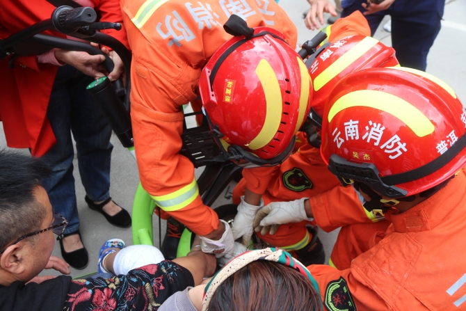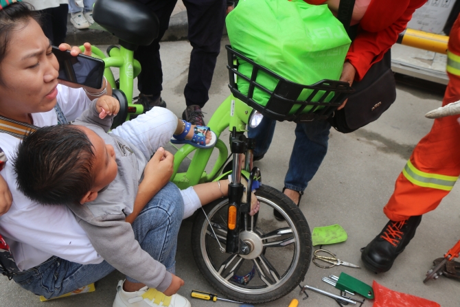 三岁小孩脚卡共享单车 消防“蜀黍”紧急救援