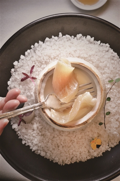 椰子炖鸡已然成为了广府汤水中的经典之一,从老城区的一间炖汤店里走出,登上了餐厅食肆的餐桌,如今在广州米其林二星餐厅,广州文华东方酒店江餐厅里也能见得其踪迹——椰皇炖花胶。总厨辉师傅用老母鸡熬煮2小时,熬出醇厚的汤底来,再加入浓郁的椰汁,汤汁顿呈乳白色,掀开那椰子盖来,浓郁的椰香扑鼻而来。一勺挖下,惊喜在其中,厚而富有胶质的花胶公,满满皆是胶原蛋白,入口滑嫩弹牙。师傅甚是贴心,还配上了一小碟醋,更能帮助开胃解腻。
