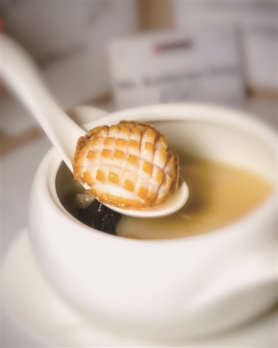 客家有一道名菜胡椒猪肚鸡煲,山区里每每天寒时,人们就用那土猪猪肚与鸡一同煲,撒上白胡椒,热腾腾打个边炉以慰冬日孤寒。丽思卡尔顿酒店中餐行政总厨黄尚烽师傅有一次与朋友吃夜宵,吃的正是胡椒猪肚鸡火锅,于是便突发奇想,何不将火锅做成炖汤?这样既可养生,又不用像火锅那样花时间和麻烦。于是他便开始改良与创作,选用农家土猪骨、猪蹄、瘦肉和农家谷饲300天的走地老母鸡,经6小时的精心熬煮。猪蹄的加入,是为了提取其丰富的骨胶原,可令汤更浓厚。在最后取汤环节,还要边大火滚边捣烂汤料,以让蛋白质、胶原蛋白等营养尽情释放到汤中。隔渣后静置一小时,撇除浮油从而得到浓郁、奶白、鲜香醇厚的精华汤底。在刚刚摘获米其林一星的丽轩中餐厅里,黄师傅带来了这款名为“胡椒猪肚鸡炖海中宝”的秋冬滋补汤水。