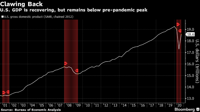 △彭博社:美国经济正在恢复,但仍低于疫情前的峰值。