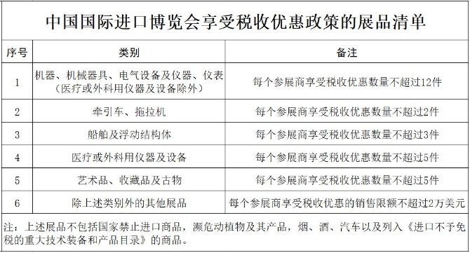注:享受税收优惠的展品不包括国家禁止进口商品,濒危动植物及其产品,烟、酒、汽车以及列入《进口不予免税的重大技术装备和产品目录》的商品。