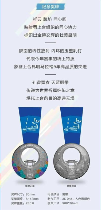 本次赛事的纪念奖牌也于当日公布,奖牌包含了祥云、牌坊等昆明自然文化元素,同心圆的形状映射着上合组织的同心协力,标识出金碧交辉的壮美昆明。同时,奖牌牌面的线性放射,内环的玉璧乳钉,代表了今年赛事的线上特质,象征上合昆明马拉松5年高品质突进。跑友可登录“咕咚”App,选择“2020上合昆明线上马拉松”,进入赛事介绍页面,按照提示点击相关按钮后,填写相关信息进行报名,咨询电话:400-0606090。(云南网 记者娄莹))