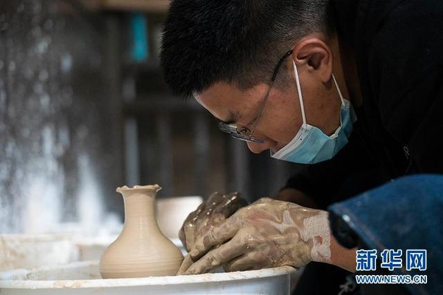 十堰市茅箭区茅塔乡东沟村由回乡创业人士开办的陶艺作坊工作人员展示陶艺制作。新华网发 刘建维摄
