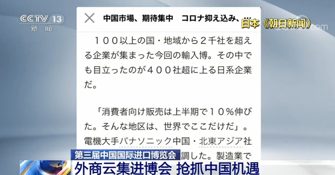 日本《朝日新闻》近日报道,在新冠肺炎疫情导致世界经济停滞的背景下,经济持续复苏的中国颇受期待,各国家和地区企业积极参展。报道称,本届进博会吸引了400多家日系企业。松下电器中国东北亚公司总裁本间哲朗强调说,面向消费者的销售上半年增长了10%,全世界能做到这一点的只有中国。 报道称,中国采取严格的疫情防控对策遏制住疫情蔓延之势,迅速恢复经济活动。生产和消费等主要指标趋于复苏,据国际货币基金组织(IMF)预测,中国是主要经济体中今年唯一实现正增长的国家。
