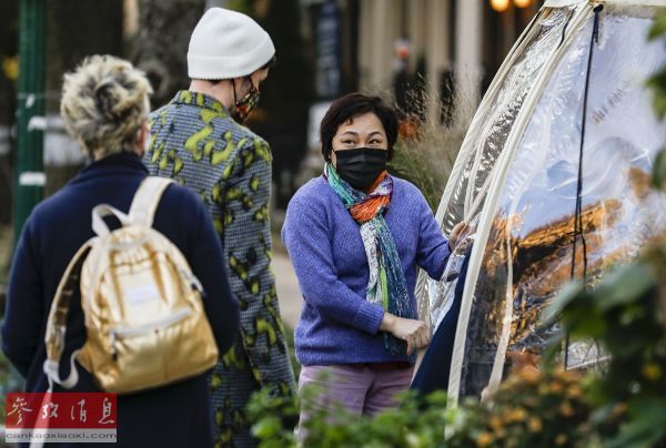 资料图片:10月30日,在美国伊利诺伊州芝加哥,一名女子将顾客带到室外用餐帐篷。
