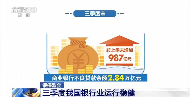 三季度末,商业银行不良贷款余额2.84万亿元,较上季末增加987亿元;商业银行不良贷款率1.96%,较上季末增加0.02个百分点。