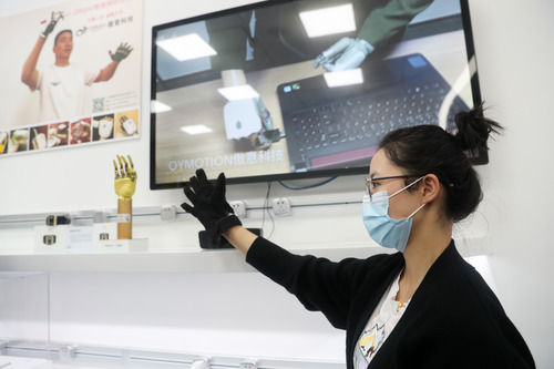 在上海张江人工智能岛内,工作人员在展示“智能神经仿生手”(11月3日摄)。新华社记者 丁汀 摄