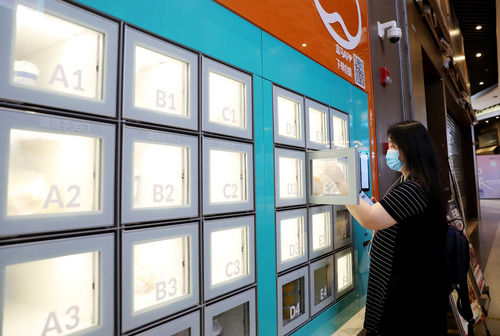 一位顾客通过APP扫码,在上海地铁13号线世博会博物馆地铁站附近的一家盒小马服务点取餐柜中拿取预定的早餐(7月17日摄)。新华社记者 方喆 摄