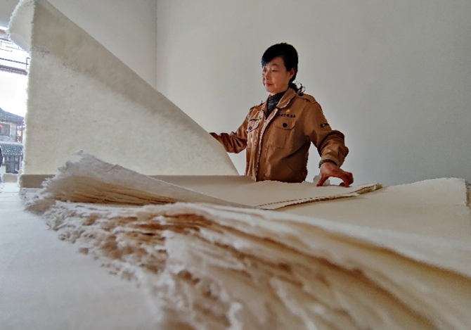 据了解,运用传统工艺制作而成的宣纸,从选材、制浆到晾晒、捞纸、剪纸等,需要大大小小108道工序,经历风吹雨打,千锤百炼,最终才能制成一张宣纸。由于原料限制,当地正宗的宣纸年产量只有800多吨,产量很低。