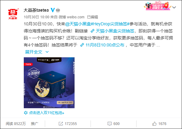 ▲天猫小黑盒尖货「沧海」的推广微博获得8522万人次阅读,超17万人转发。