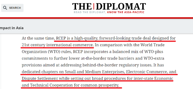 《外交官》杂志网站称,RCEP是为21世纪国际贸易而设计的高质量、前瞻性的贸易协定。与世界贸易组织的规则相比,RCEP的规则更加均衡,并专门针对中小企业、电子商务与贸易争端的解决,同时为国际经济合作、技术合作规定了共同的发展规则。