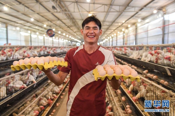 广西武宣县金鸡乡仁元村的返乡创业者覃永灵在养殖场内展示他收获的鸡蛋(6月18日摄)。新华社记者 曹祎铭 摄