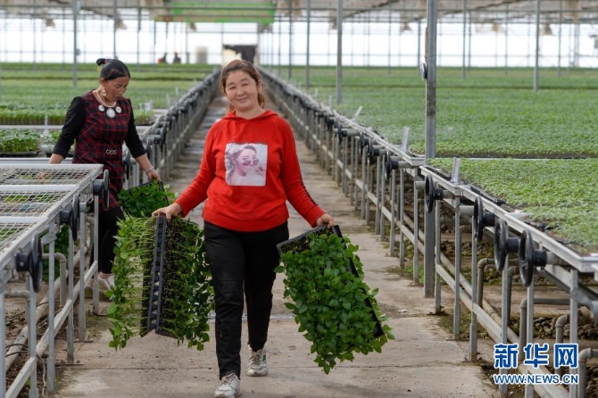 在新疆阿克陶县现代设施农业产业扶贫基地,工人在育苗温室内搬运菜苗(3月22日摄)。新华社记者 丁磊/摄