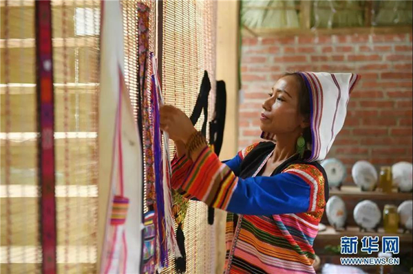 景洪市基诺山基诺族乡巴飘村村民姿梅在整理出售的传统手工织物(2019年6月10日)。新华社记者 秦晴 摄