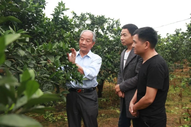 2020年5月23日,赣州市信丰县大塘长岗村的客乡橙园里,“赣南脐橙引种第一人”袁守根(左)在传授脐橙种植技术 刘青 摄