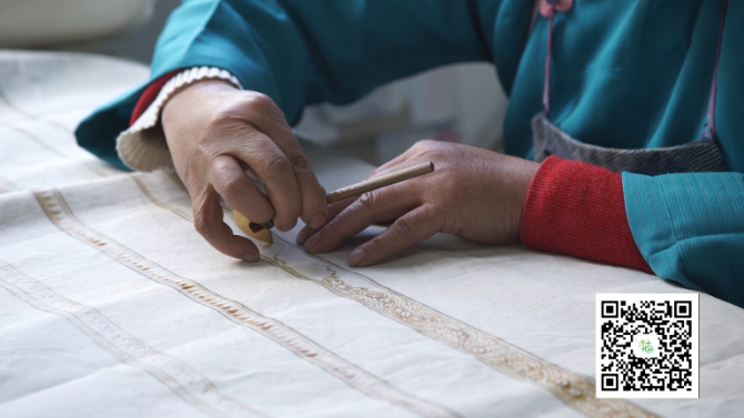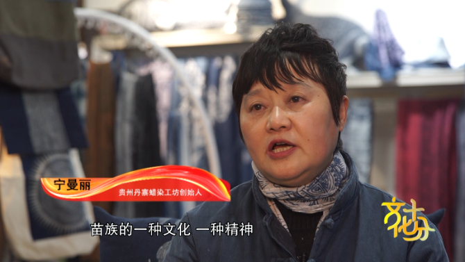 贵州丹寨蜡染工坊创始人 宁曼丽:苗族蜡染它表达的是苗族的一种文化,一种精神。它的很多的图案里面都有他们的符号,都有他们的图腾,有他们五千年迁徙的历史的印迹,所以苗族它虽然没有文字,它是把它的文化,把它的历史穿在身上,绣在身上,画在身上,刻在身上,写在身上。