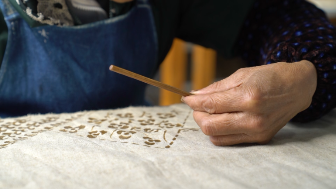 苗族蜡染技艺传承人 杨乃金:传说一个姑娘生病了,就拿那个草药挤出来汁液喝,变成那个药水,喝了病就好了。苗家人也不知道怎么感谢它,所以画在衣服上来穿,现在那个窝妥纹也是由很久以前那个故事演变出来的。