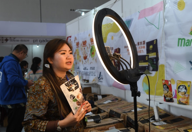 11月27日,在南宁国际会展中心,参展商通过网络直播推销商品。 新华社记者 陆波岸 摄