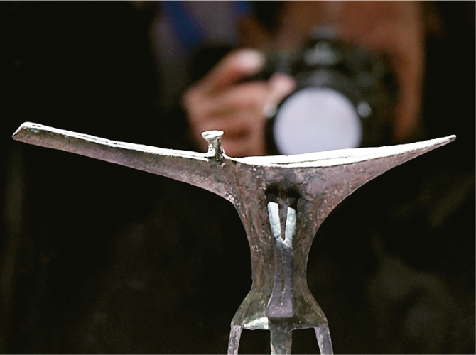 二里头遗址位于河南省洛阳市偃师二里头村,距今约3800—3500年。历经几代人的不懈探索,目前二里头遗址发现了中国最早的“紫禁城”、最早的城市主干道网、最早的青铜礼器群及铸铜作坊、最早的双轮车辙……成为寻找夏代最重要的一把钥匙。图为2019年10月19日,参观者在二里头夏都遗址博物馆内拍摄展品“乳钉纹铜爵”。 新华社记者 李安/摄