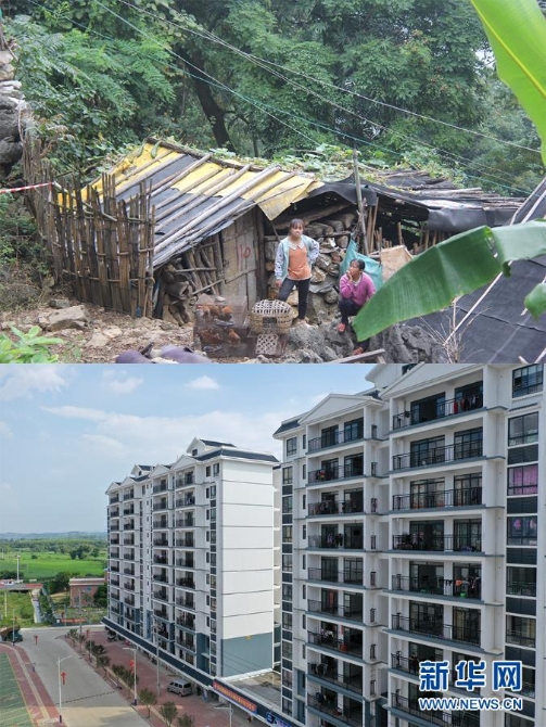 这是一张拼版照片,上图为:2018年11月11日在广西田东县思林镇龙邦村拍摄的村民和自家简陋的房屋(思林镇政府供图);下图为:2019年8月28日拍摄的当地为龙邦村新建的位于广西田东县思林镇的易地扶贫搬迁安置点(无人机照片,新华社记者 曹祎铭 摄)。新华社发