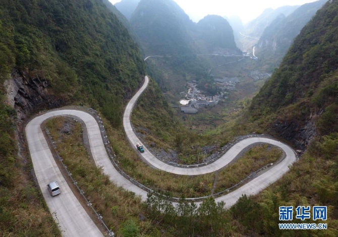 广西百色市凌云县泗城镇陇雅村境内的道路(2017年3月12日摄,无人机照片)。新华社记者 陆波岸 摄