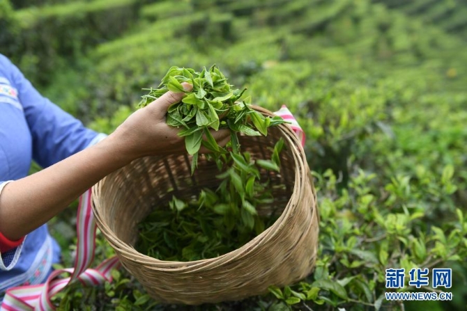 在广西百色市凌云县一处有机茶园,当地茶农在采春茶(2019年3月27日摄)。新华社记者 陆波岸 摄
