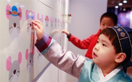 12月5日,一名小朋友在敦煌市沙州镇南街社区观看文化墙。新华社发(张晓亮 摄)