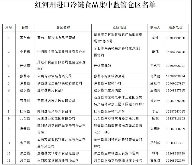 一、我州在13个县市各设立1个进口冷链食品集中监管仓区。自2020年12月5日零时起,凡从省外进入我州储存、加工、销售的进口冷链食品,必须进入各县市集中监管仓区进行预防性消毒和采样核酸检测,并取得出库证明。从省内进入我州的进口冷链食品,必须取得省内集中监管仓区出库证明、进口冷链食品货物业经消毒证明和核酸检测报告,方可在我州储存、加工、销售。