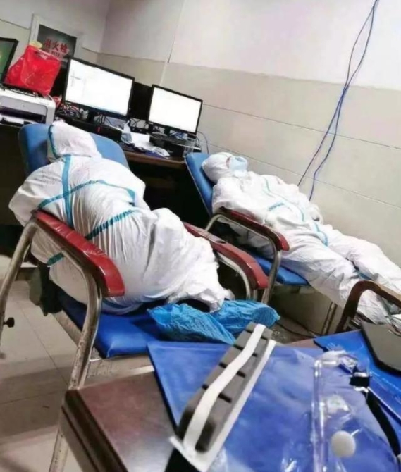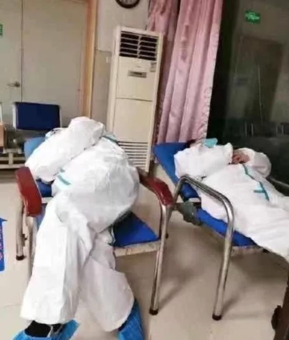 疫情初期,蜷缩在地上、椅子上入睡,是一线医护人员的“标配”。