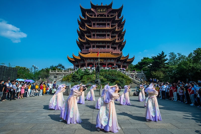 △10月1日,游客在湖北武汉黄鹤楼景区观看演出。根据今年国庆节、中秋节假期八天的旅游市场数据,全国共接待国内游客6.37亿人次,实现国内旅游收入4665.6亿元。