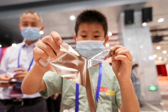 △8月23日,2020年山西省科技活动周在山西省科技馆启幕。一名儿童在体验“手撕钢”。