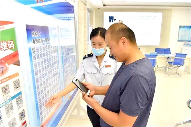 △一名税务人员正在帮助纳税人通过手机扫描办税,纳税人可随时随地办理各类业务,实现办税“一次也不跑”。