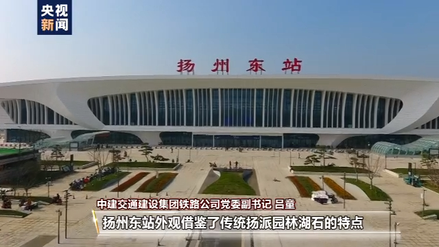 中建交通建设集团铁路公司党委副书记 吕童:扬州东站外观借鉴了传统扬派园林湖石特点,并在室内装修中融入扬州剪纸、琼花等文化符号,让广大旅客在旅途中就能感受扬州这个好地方的文化魅力。