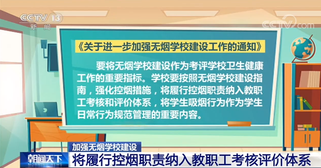 《通知》要求,要将无烟学校建设作为考评学校卫生健康工作的重要指标。学校要按照无烟学校建设指南,强化控烟措施,将履行控烟职责纳入教职工考核和评价体系,将学生吸烟行为作为学生日常行为规范管理的重要内容。