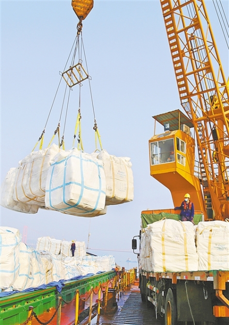12月10日,湖北省宜昌市兴发集团新材料产业园,员工在装运草甘膦产品,该批产品将通过长江黄金水道出口到南美洲。今年前三季度,兴发集团抢抓外贸出口商机,全集团出口创汇4.2亿美元,同比增长7%。经济日报-中国经济网记者 柳洁/摄