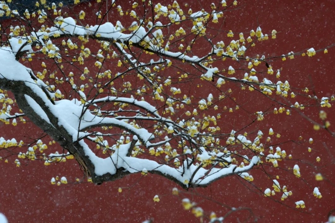 这是2018年1月27日在南京市明孝陵景区内拍摄的雪中梅。新华社发(王跃武 摄)