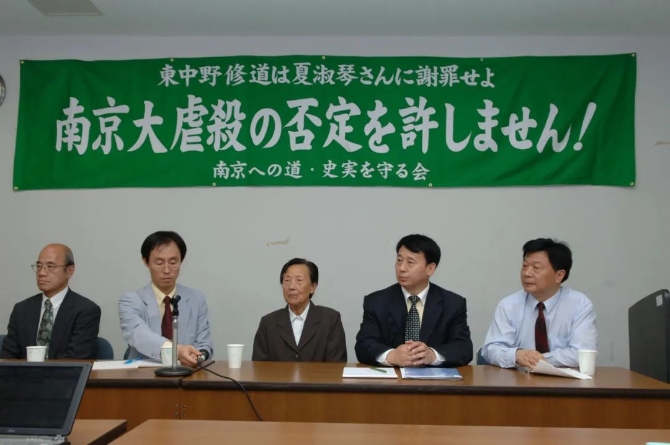 2019年12月3日,南京大屠杀幸存者葛道荣(前排左一)、夏淑琴(前排左二)、艾义英(前排右一)及新确认死难者周万荣的女儿陶秀华(前排右二)在家祭活动现场。新华社记者 李博 摄