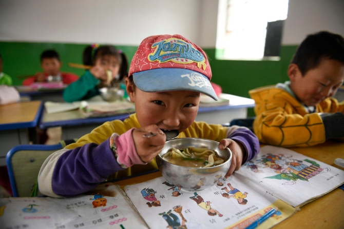 2017年6月14日,宁夏西吉县震湖乡陈岔小学的孩子在教室吃午餐,学生每天在学校有两顿国家提供补助的营养餐。(新华社记者王鹏摄)