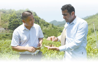 6月30日,在陕西省汉中市镇巴县三元镇兴顺农牧业有限责任公司的茶园里,金乐天(右)和公司负责人马忠华进行交流。新华社记者 李一博摄