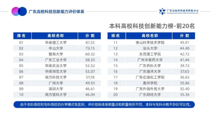 当日,大会现场发布了《广东高校科技创新能力报告》(下简称《报告》),并展现本科高校科技创新能力榜前20位和专科高校创新能力榜前10位。该报告以引导科研评价的质量和贡献导向,响应国家“破五唯”改革,重点评价高校机制体制活力、研发潜力、社会贡献、支撑人才培养情况等因素。报告旨在从原有高校传统排名指标体系之外,为高校创新能力评价提供一些新的角度。