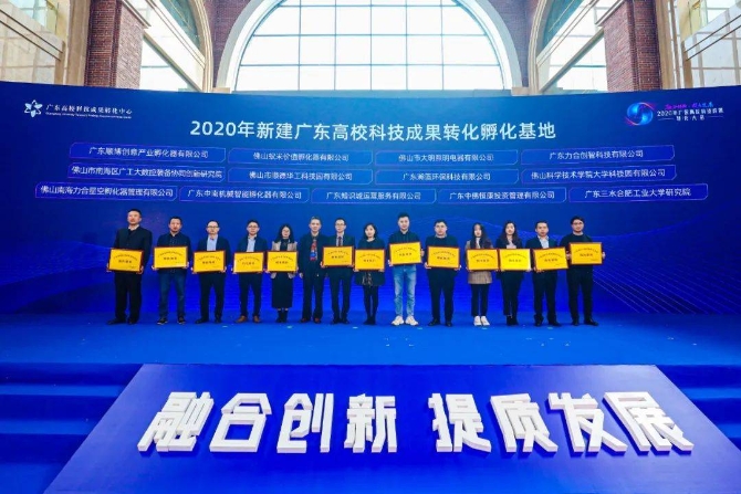 大会举行了广东高校科技成果转化孵化基地和高校工作站授牌仪式。佛山市教育局局长商学兵为顺博创意产业园、蚁米价值孵化器、大明照明电器和广工大数控装备研究院等13家2020年新建广东高校科技成果转化孵化基地授牌。