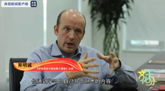 《用英语讲中国故事大课堂》主讲 斯明诚:我觉得从一个教育者的角度,通过学习你自己非常熟悉的内容,熟悉的故事来学习外语,其实本身是一件很有价值,而且很有效果的一件事。希望更多学生意识到,通过学习英语,可以把中国文化传递给全世界。