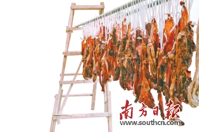 “小雪腌菜,大雪腌肉。”大雪节气过后,北风阵阵,天气越来越冷,惠州家家户户忙着腌腊肉、腊鱼、腊鸭,灌腊肠,以便在冬日里享受传统的腊味。走在大街小巷,无论是院子里还是阳台上,随处可见一串串油亮剔透的腊味,在冬季暖阳和北风的酝酿下,显得格外诱人。满街飘香的腊味,也成了这座城市的独特风景线。