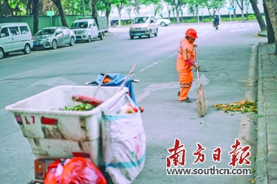 不少阔叶树木开始落叶。图为清洁工在清扫落叶。