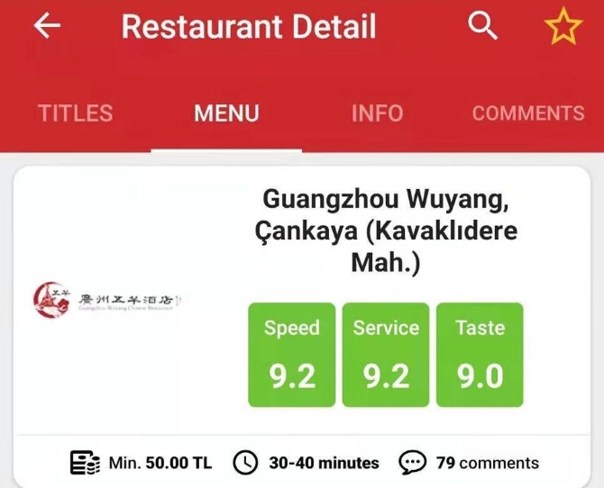 不能堂食,便在外卖上想办法!餐厅在土耳其几大外卖平台完成注册,不仅坚持菜品价格不变,还在顾客下单时配送免费小零食。在土耳其一个主要外卖平台上,广州五羊餐厅得到9.2分(满分10分)的顾客评分。