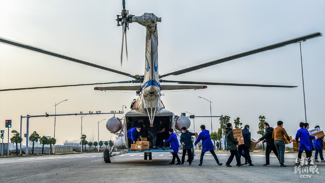 △2月3日,湖北襄阳工作人员正在从直升机上卸下防疫物资。