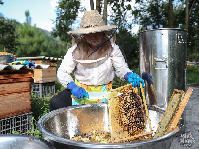 △11月23日,贵州宣布最后9个深度贫困县退出贫困县序列,标志着我国新时代脱贫攻坚目标任务如期完成。这是贵州9个深度贫困县之一的紫云县村民发展“林下蜂”产业,收割蜂蜜。